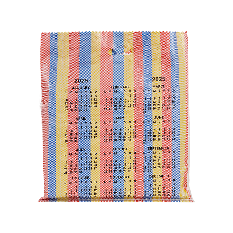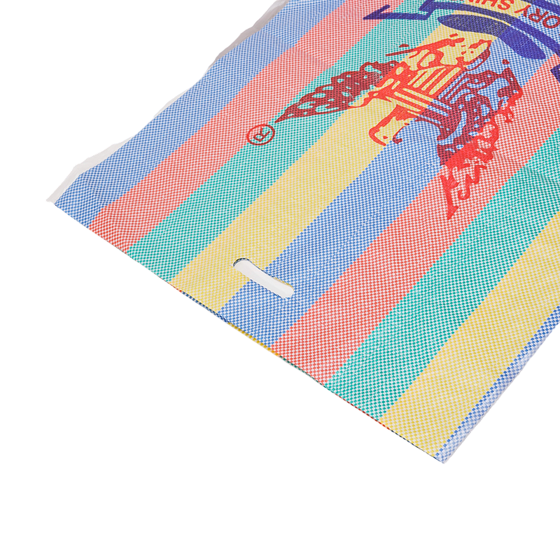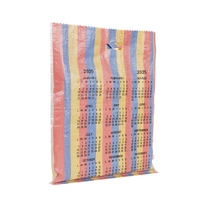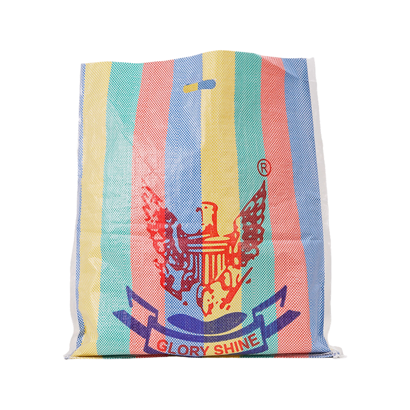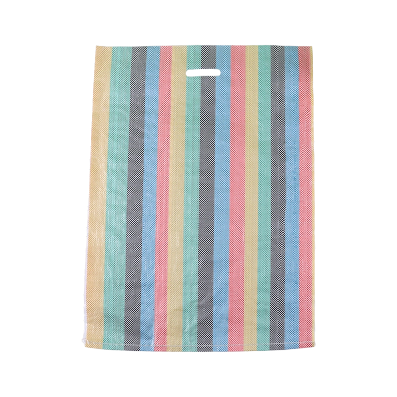 This D-handle, colorful striped woven polypropylene bag features a striking, highly recognizable design with vibrant multi-colored vertical stripes, making it suitable for various carrying and packaging needs and popular in many international markets.